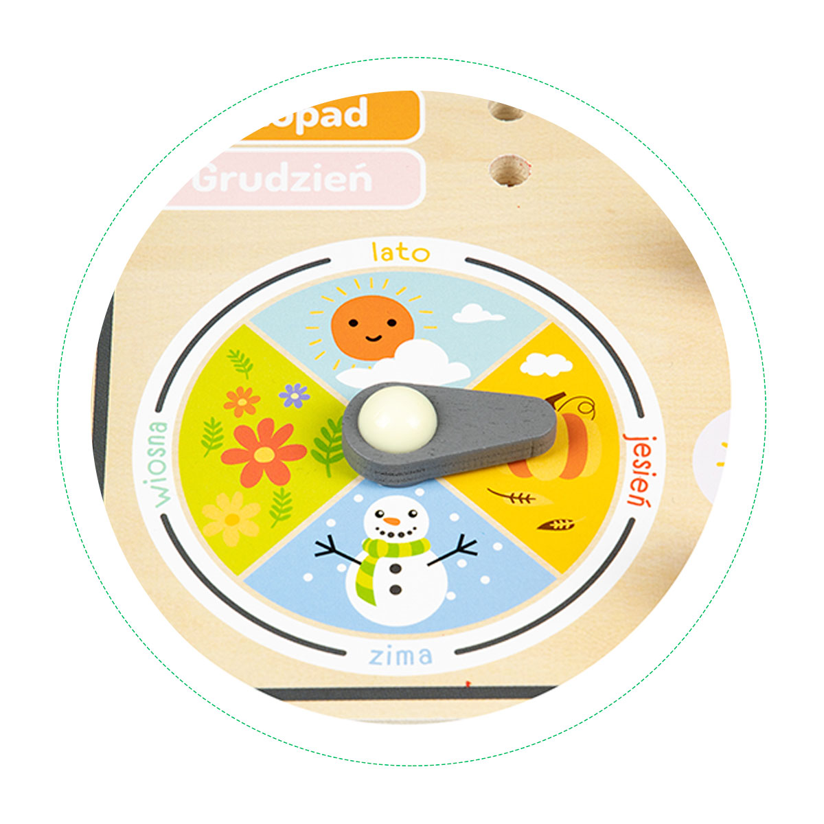 • Nauka pór roku – w dolnym narożniku znajduje się tarcza z obrotową wskazówką do zaznaczania pór roku. Dziecko będzie miało możliwość poznania poszczególnych pór roku i kolejności ich występowania.